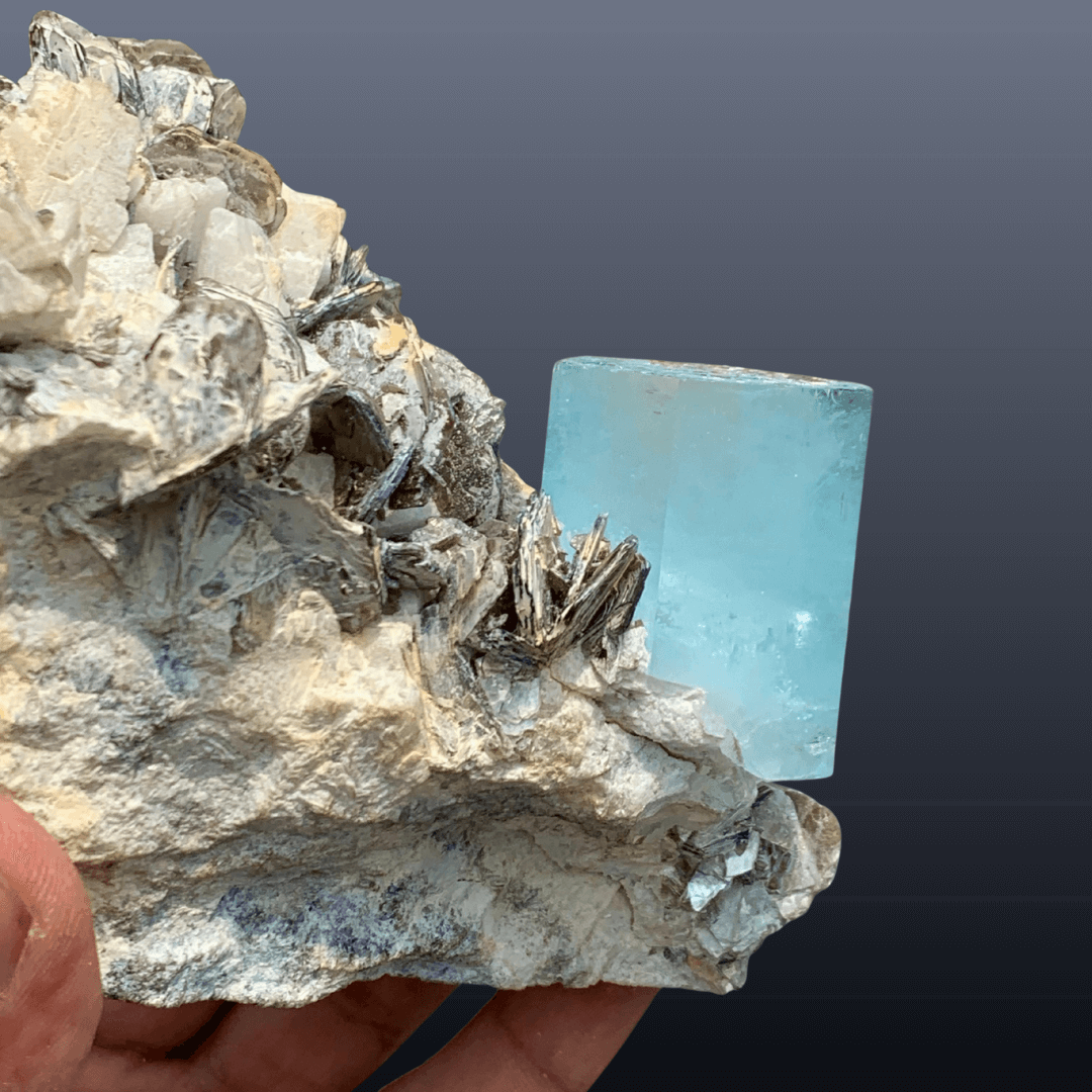 This natural aquamarine cluster specimen from Pakistan is a rare collector’s piece, sourced directly from the famous Nagar Mine. Featuring a striking combination of aquamarine crystals with mica and feldspar, this specimen showcases the unique feldspar and mica mineral association with aquamarine that makes it highly sought after by collectors and enthusiasts.